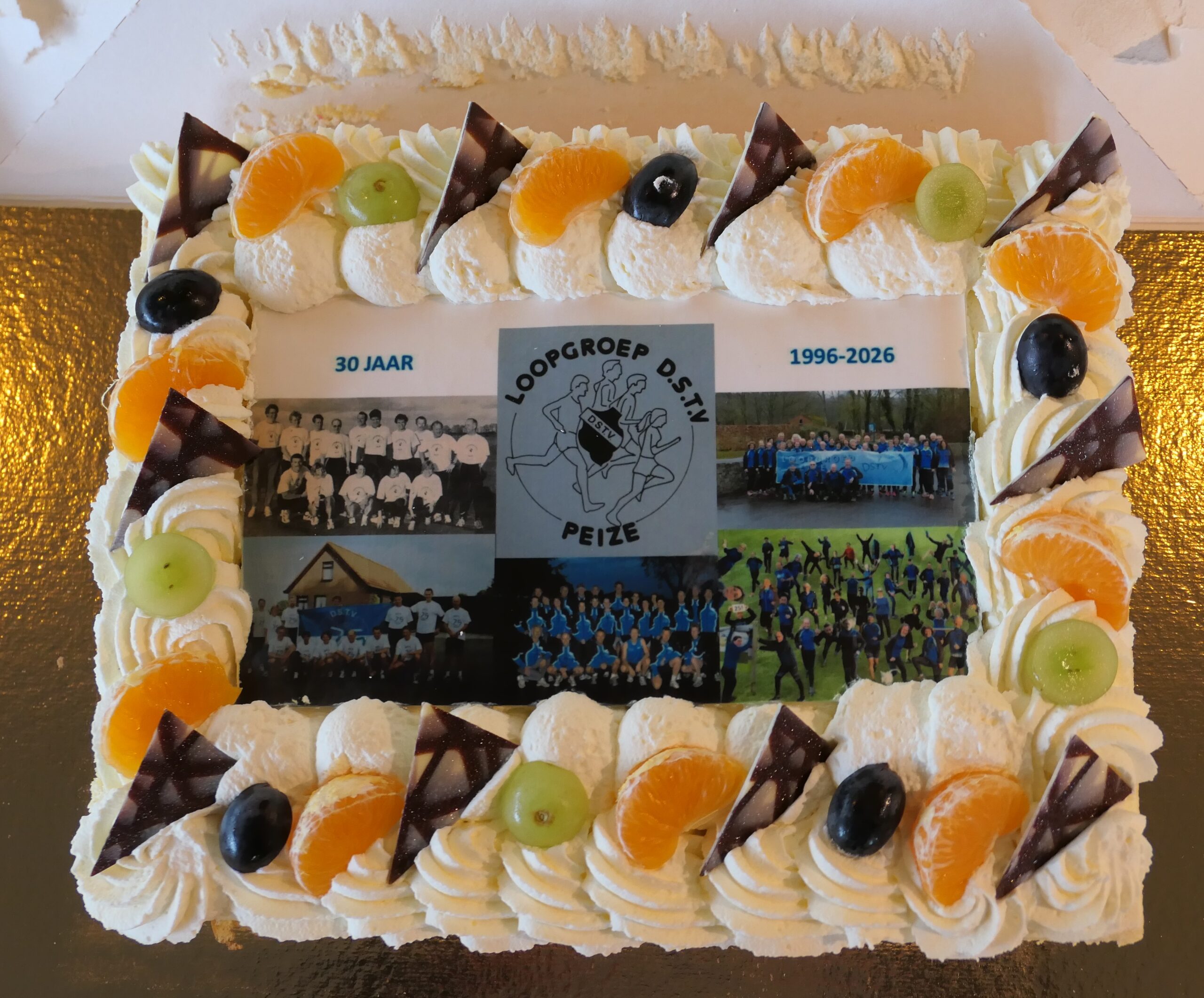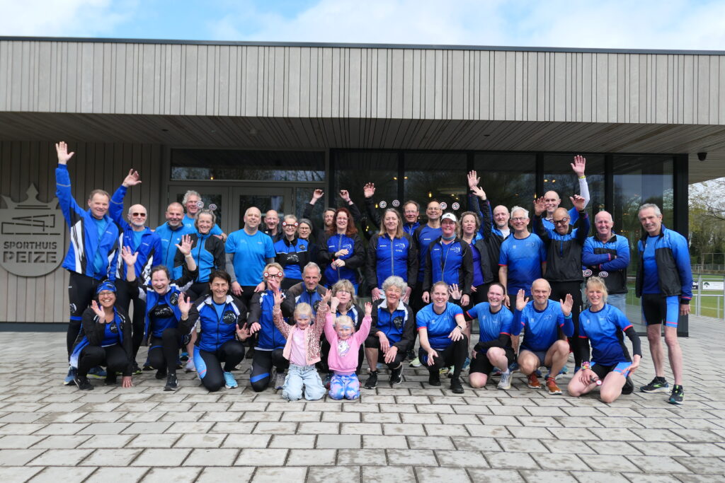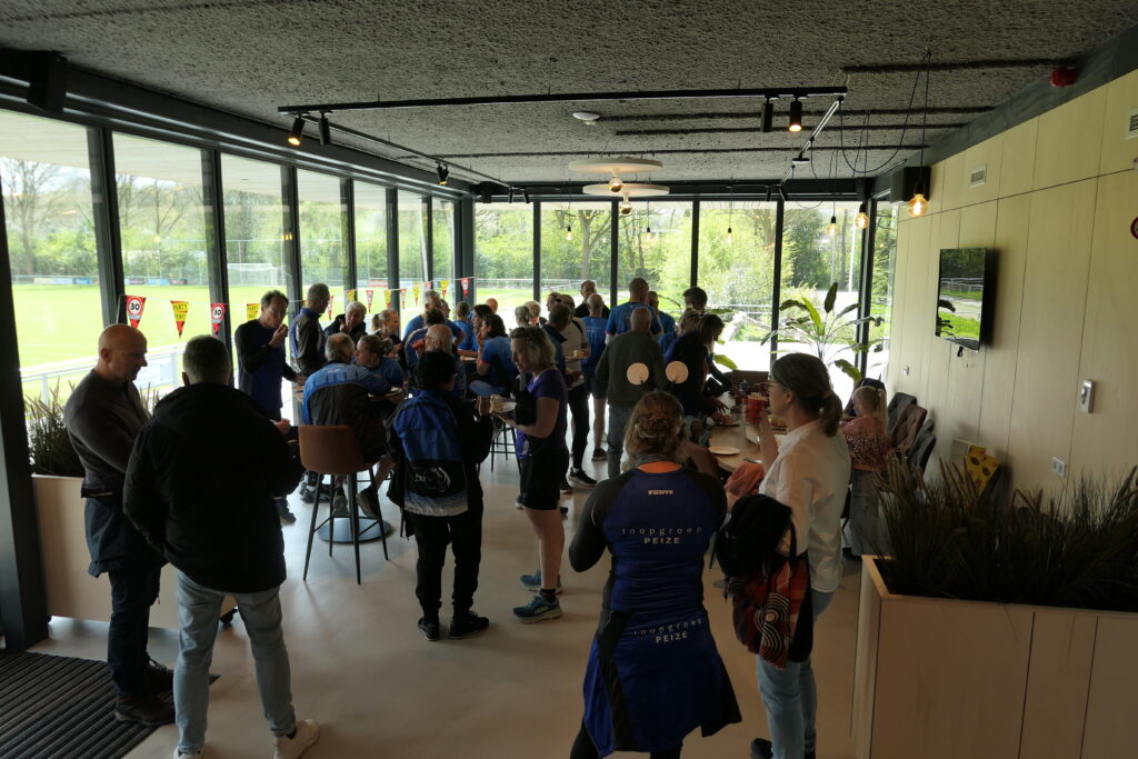 Rond 12 uur kwamen de groepen aan bij het Sporthuis. Daar werd een clubfoto gemaakt. De foto geeft een beeld van de verschillende kleding, die de loopgroep van 1997-2025 heeft gedragen/draagt. In het Sporthuis wachtte voor alle deelnemers een kop koffie/thee en een stuk jubileumtaart. Voorzitter Robert Bolt zette Harry Kuipers nog even in het zonnetje, omdat Harry na (bijna) 30 jaar gestopt is als trainer. Tot slot werden ruim 200 foto’s over de 30-jarige geschiedenis van onze loopgroep vertoond.